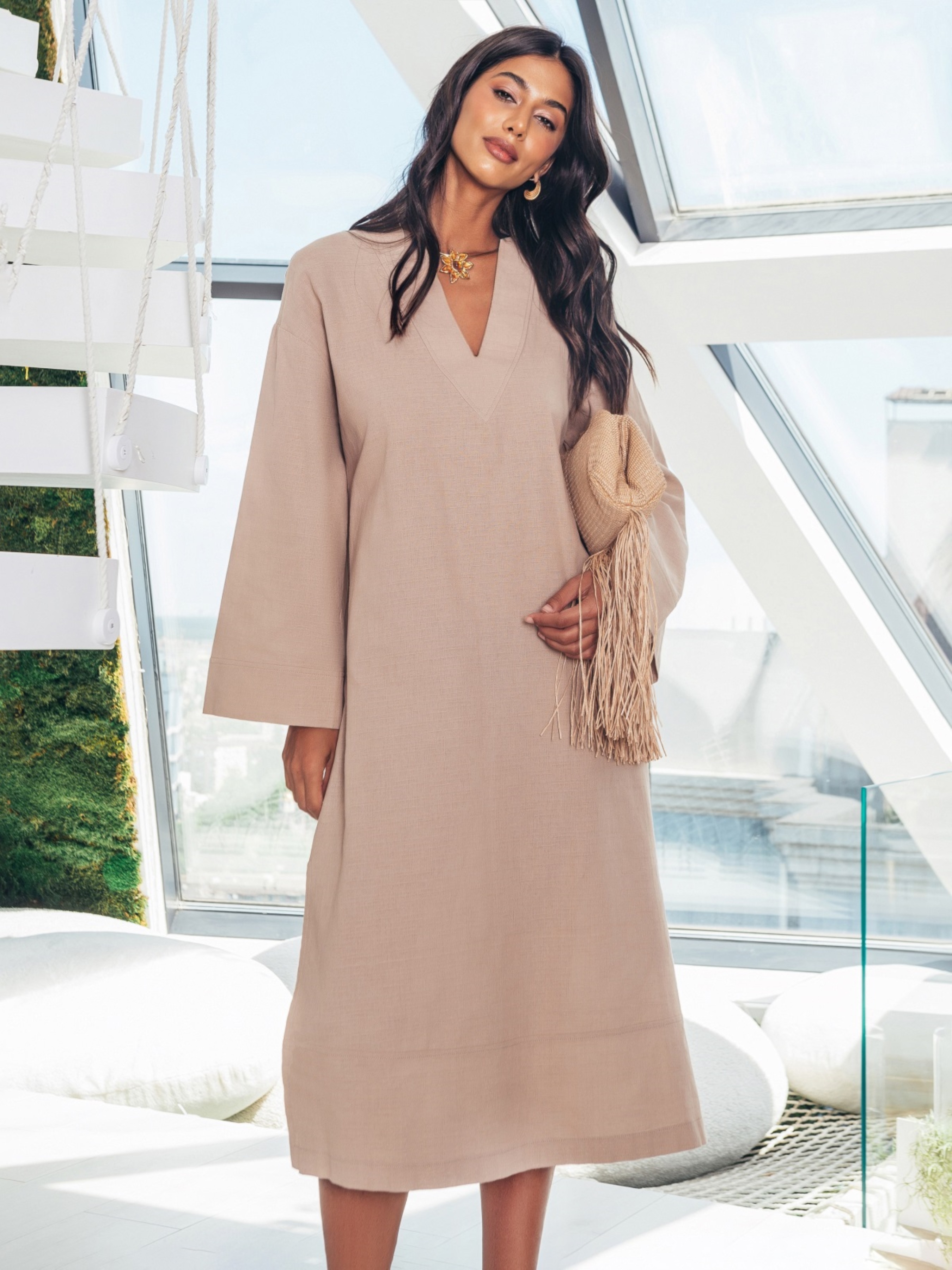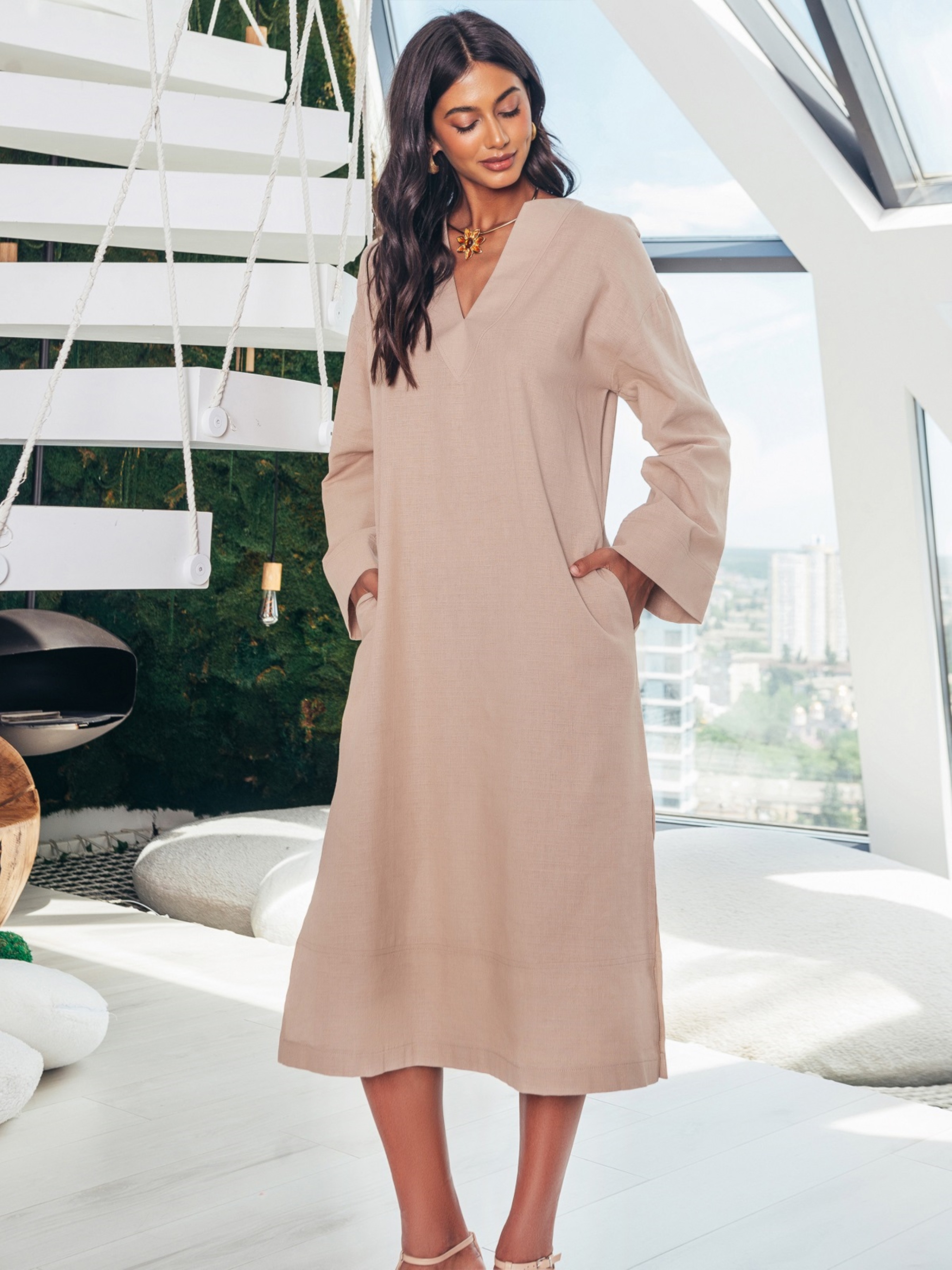Сукня-міді вільного крою. Модель із V-подібним вирізом горловини. Довгі рукави зі спущеною лінією плечового шва. Для комфорту в носці доповнена розрізами з боків. Виріб без застібки.