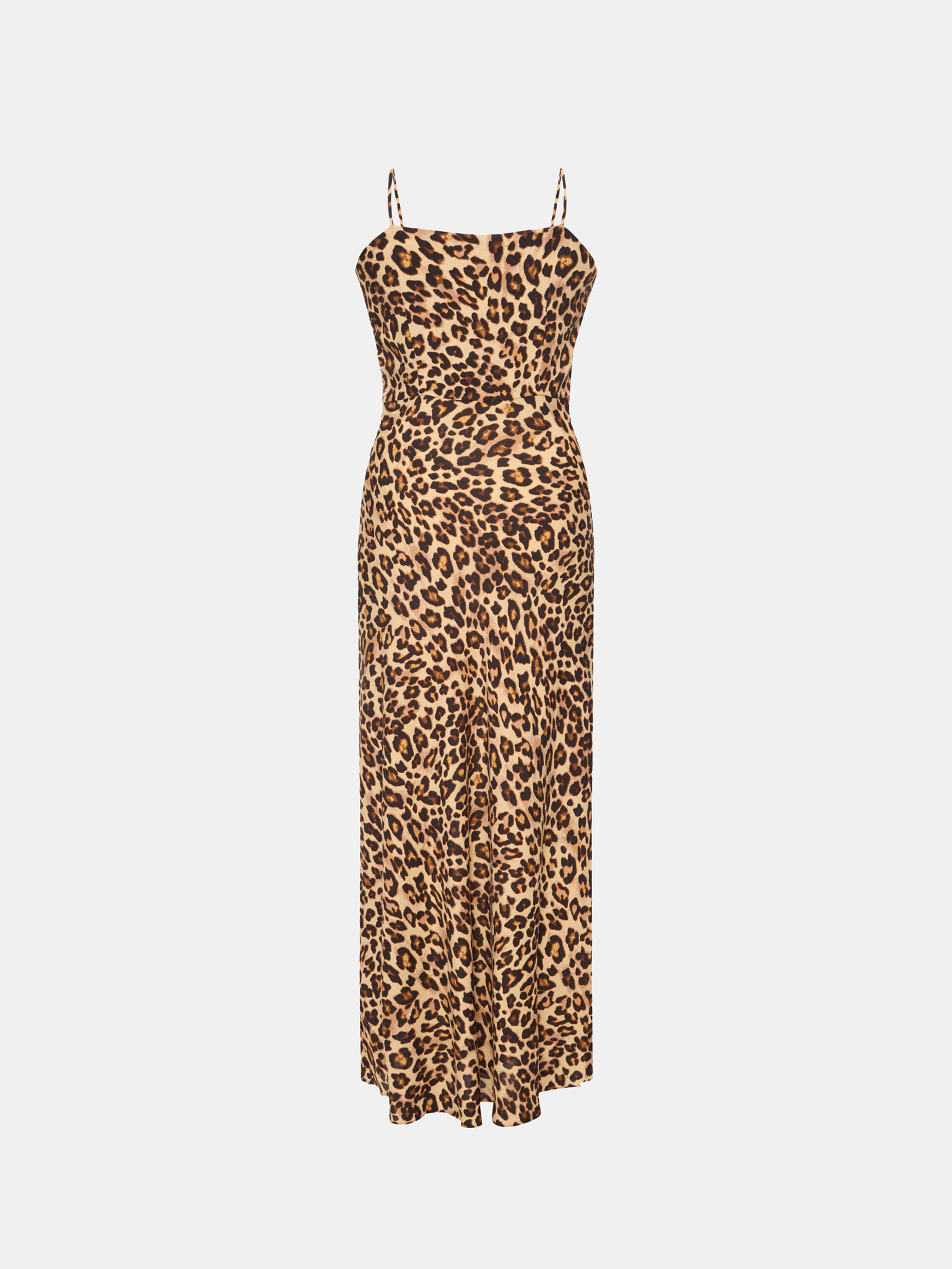 Елегантне плаття з анімалістичним принтом зі 100% віскози. Приталений силует на лямках. Блискавка по боковому шву. Зона декольте регулюється.