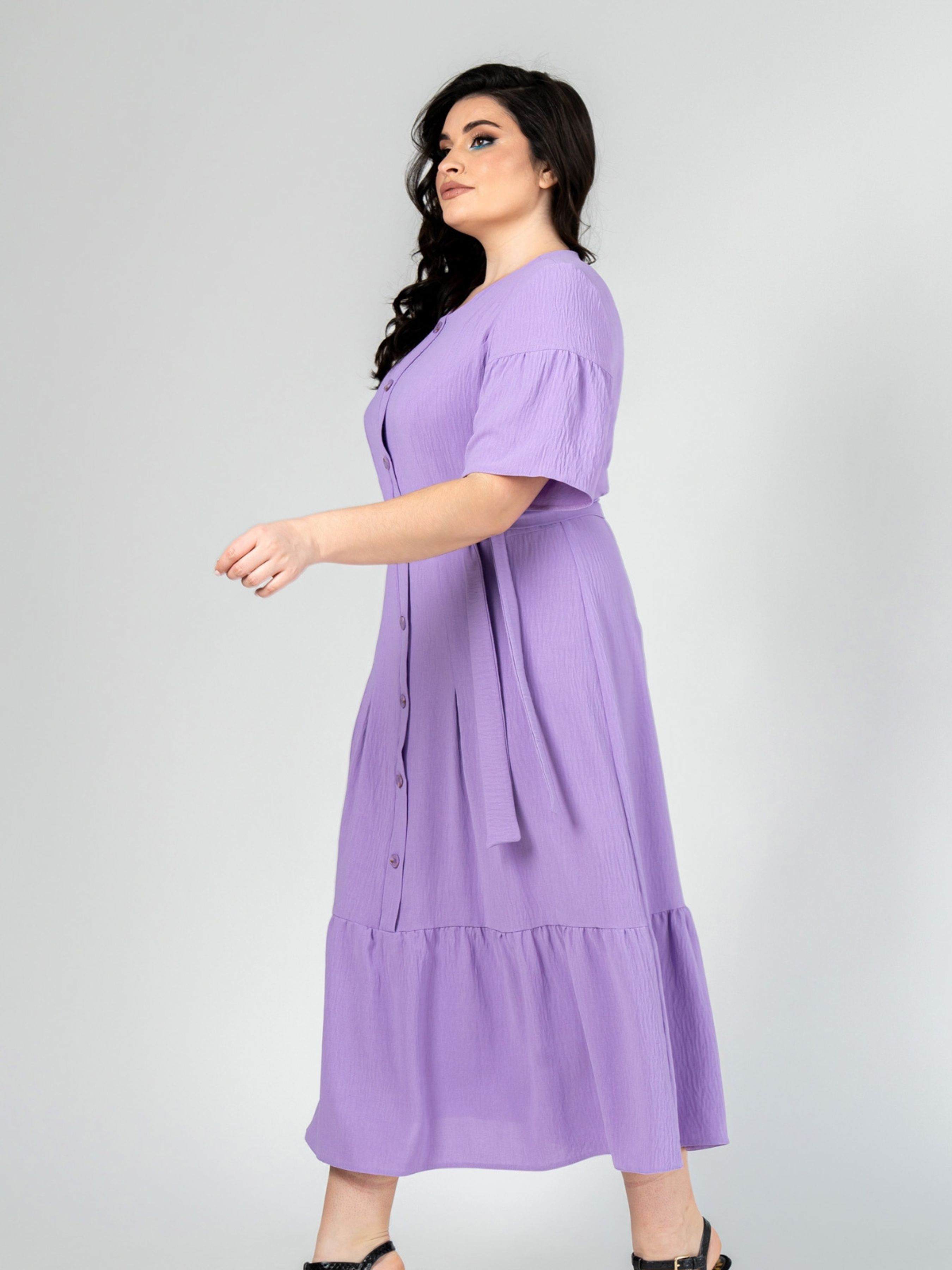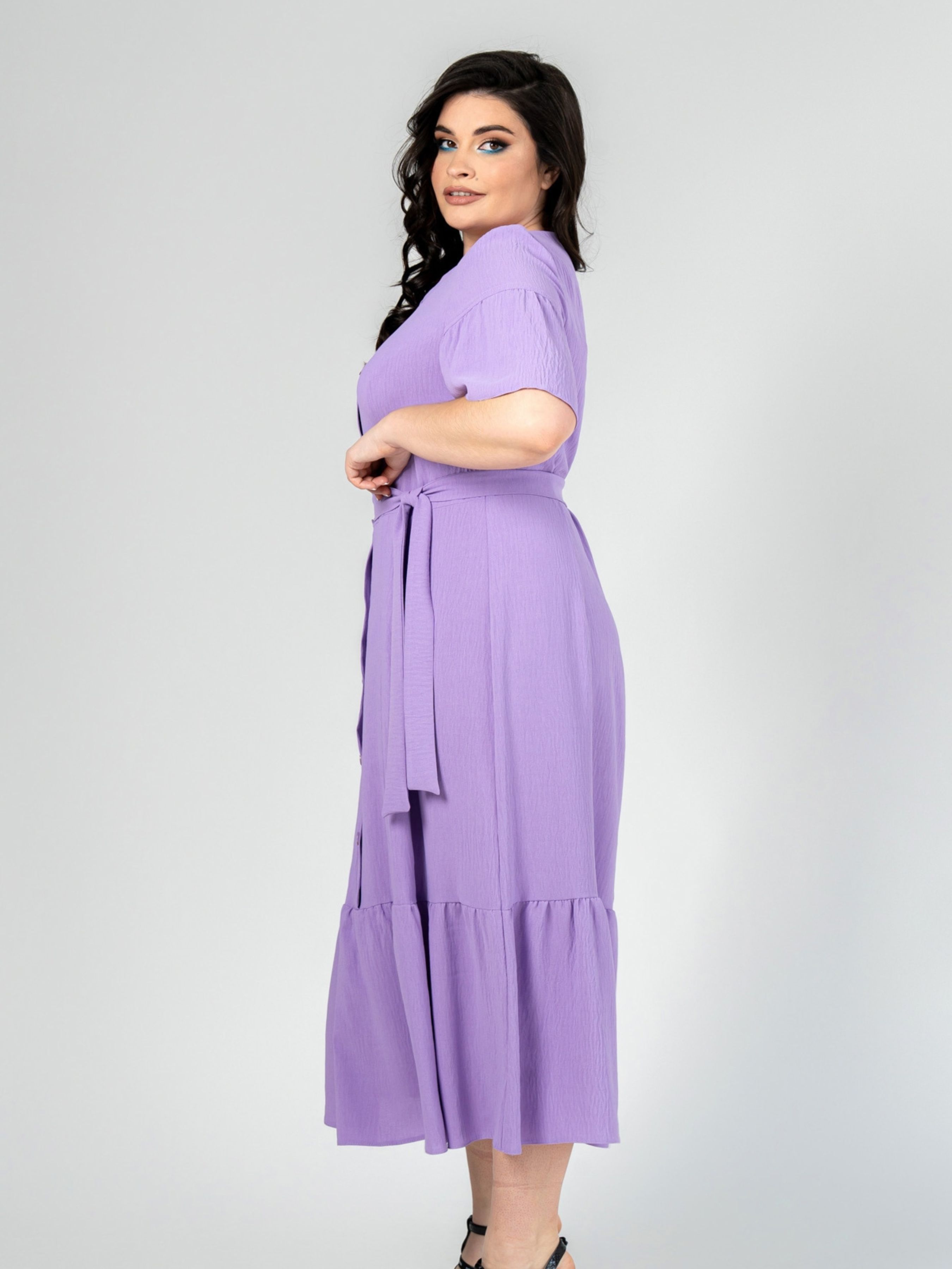 Сукня прилеглого силуету з американського крепу. Тканина злегка стисла, не мнеться і не просвічується, має зернисту, шорстку структуру, розтяжність низька. По спинці – центральний шов та виточки. Рукав втачний, розширений донизу. Полиця відрізна по лінії талії. У верхній частині полиці – рельєфні шви, у нижній частині застрочені склади. По центру полиці – імітація планки, декорована ґудзиками. По низу виробу - збирання. У комплекті: пояс із тієї ж тканини. Підійде для повсякденних літніх образів. Доступні розміри: 50-60. Характеристики: Тип тканини: американський креп - злегка стисла, не мнеться і не просвічується, має зернисту, шорстку структуру, розтяжність низька. Склад тканини: поліестер 85% віскоза 15%.