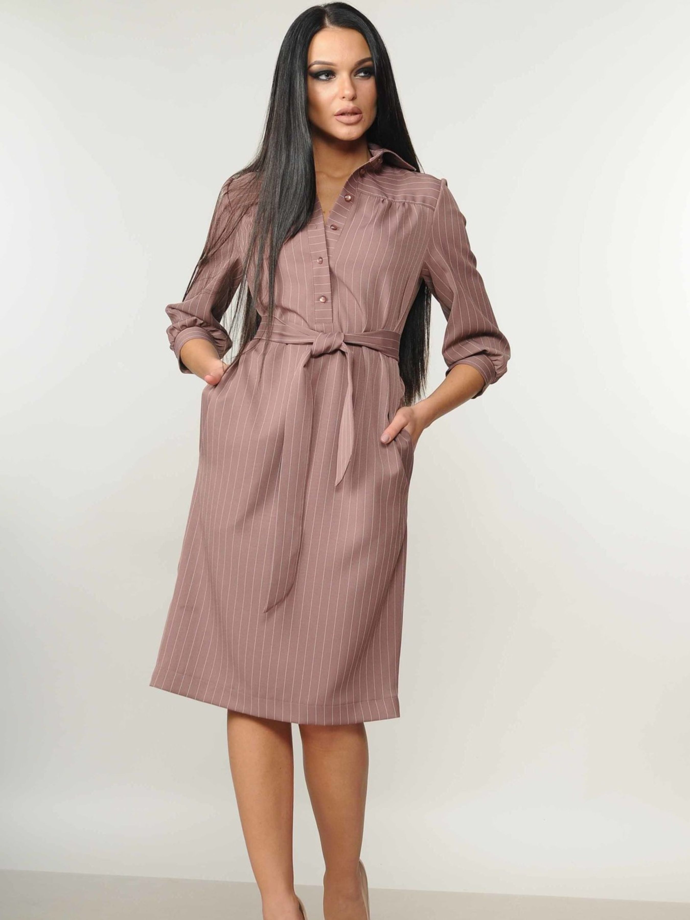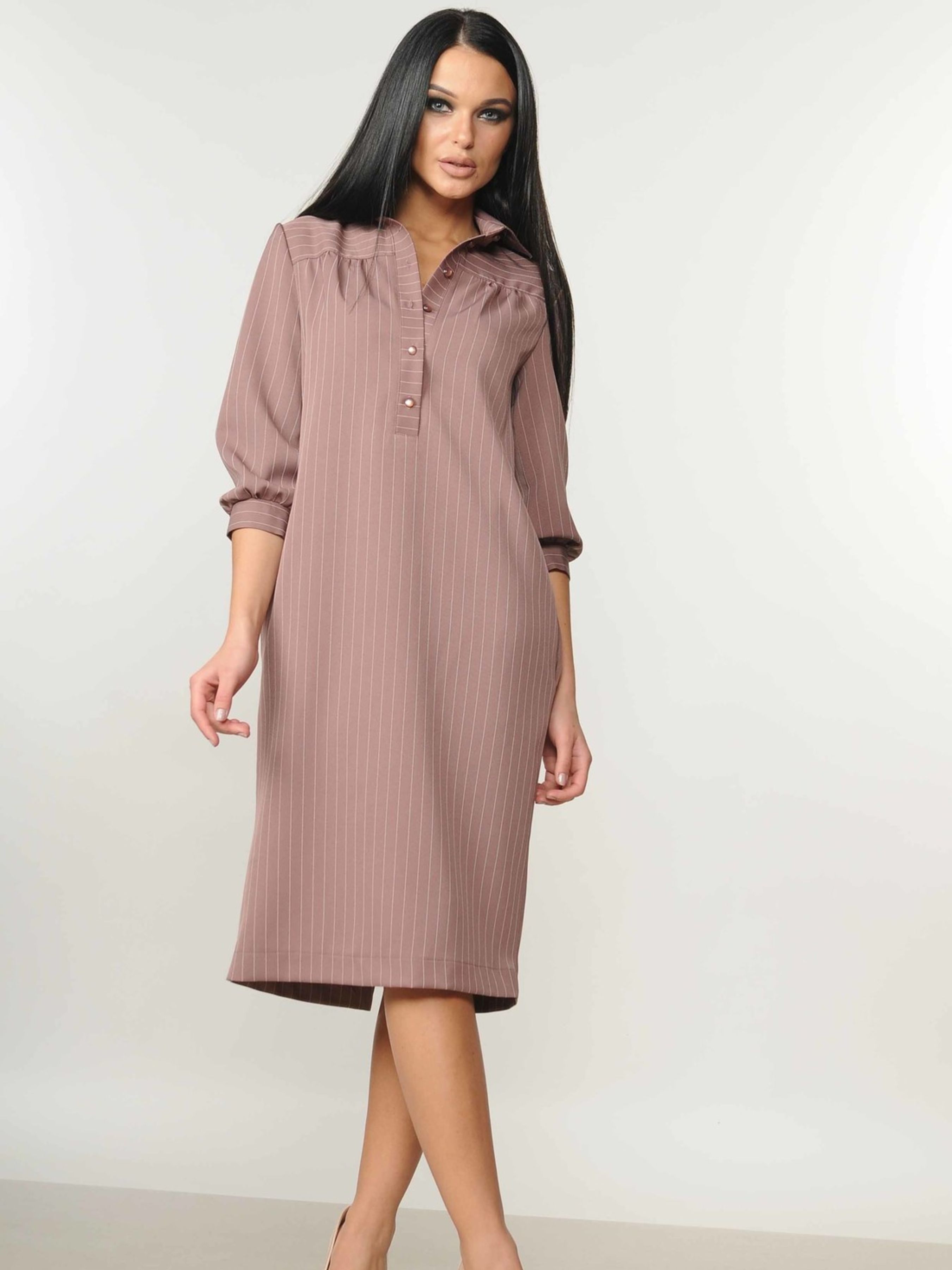 Стильна демісезонна сукня довжиною нижче коліна, виконана у вільному сорочковому крої, стане елегантним рішенням для ділового гардеробу, відповідаючи стандартам корпоративного етикету. Оригінальні вільні рукави ¾ зі складками біля манжету та акуратний сорочковий комір-стійка, від якого до пояса спускається функціональна планка на ґудзиках, додають сукні вишуканості. Спинка сукні має середній шов із невеликим розрізом унизу для зручності рухів, а практичні кишені, розташовані в бокових швах, додають функціональності. Виготовлена з якісної костюмної тканини, ця сукня поєднує елегантний зовнішній вигляд та комфорт у носінні протягом усього дня. Характеристики: Матеріал: Костюмна тканина (70% віскоза, 30% поліестер) Сезон: Демісезон Крій: Вільний, сорочковий Довжина: Нижче коліна Комір: Сорочкова стійка Рукав: ¾, вільний, зі складками біля манжету Застібка: Функціональна планка на ґудзиках до пояса Спинка: Середній шов з розрізом унизу Деталі: Кишені в бокових швах Стиль: Діловий, елегантний, корпоративний