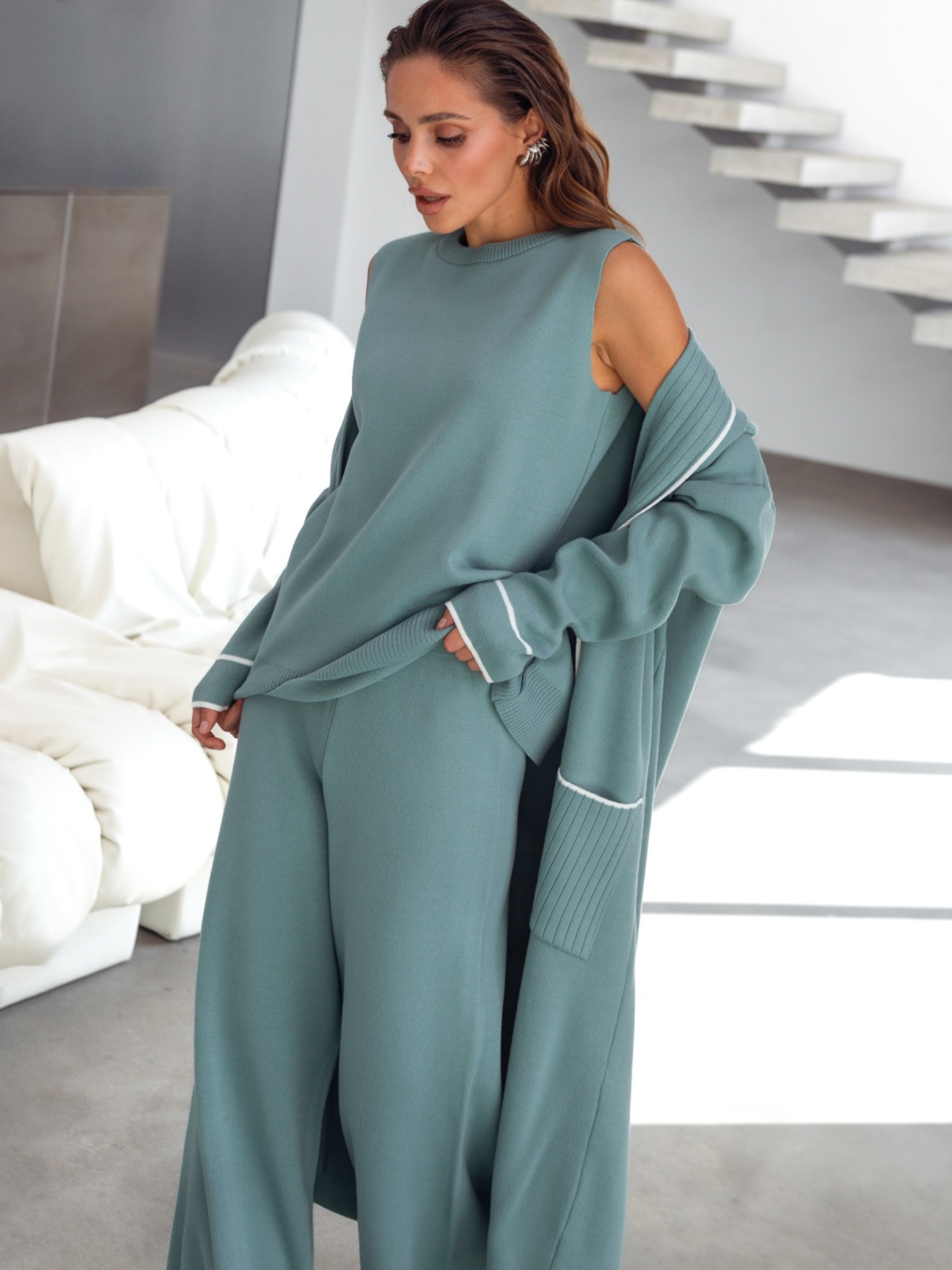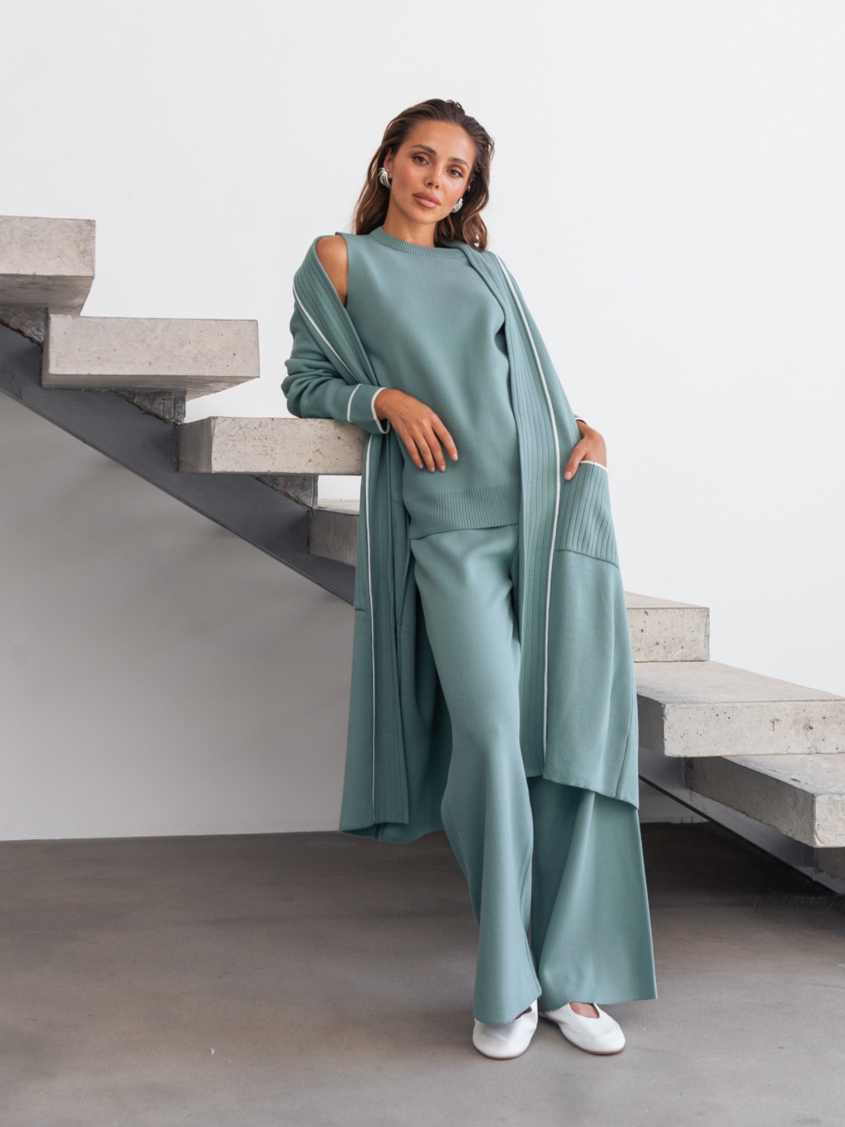 Елегантний трикотажний костюм з високоякісного турецького матеріалу. Кардиган без застібки. Подовжені рукави зі спущеною лінією плечового шва. Попереду доповнений накладними кишенями. Жилет із круглою горловиною. Низ зв'язаний гумкою. Широкі штани з гумкою на талії.